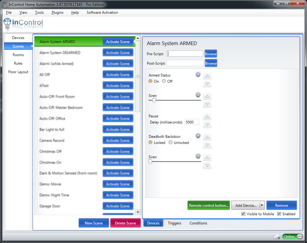 This tutorial will discuss how to setup InControl to function as an self-monitored alarm system. We'll take advantage of InControl's Virtual Devices to keep track of the status of the system. 3 scenes will be utilized to monitor motion and door sensors and to sound the alarm or send an email when something doesn't seem quite right.
