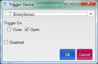 As promised, here's the meat of the system. Head over to the Triggers tab on your Alarm! scene. You'll add a Device Trigger for each of your motion sensors and door/window sensors. If any of these are tripped, it'll activate the scene. Click the down arrow next to "Add Time Trigger" to find the option for adding a device trigger. Here's a sample of a door/window sensor device trigger:
