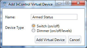 I utilize an InControl virtual device to keep track of the status of my system: either Armed or not. Go to the Plugins menu and choose "InControl Virtual Device" and add a new one. Choose a device of type "Switch" and name it "Armed Status." Choose OK and after a few seconds you'll see it show up in your list of devices.